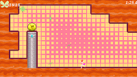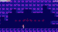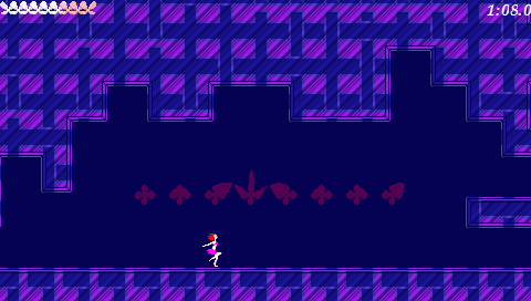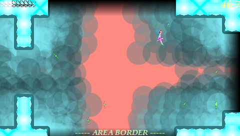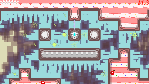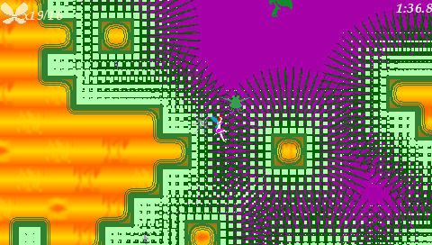 Because there's no end to the world, and the powerups increase ability rather than grant new ones, the point of the game changes. There is a time limit, and the idea is to go as far as you can during it. Although it starts at only ten seconds, you can extend it continually by finding "sparks," which are scattered around with the ubiquity of Mario's coins. The game is played for high score. The two scores provided are raw distance from the starting location upon death, and a more traditional score that generally measures playing ability and accomplishment.
