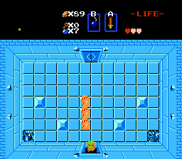 Also in each dungeon is at least one boss, and one of the bosses in each guards a "Triforce piece." The ultimate object of the game is to get eight Triforce pieces, which unlocks the way into the ninth and last dungeon. In there is Ganon, the hardest boss, who guards Princess Zelda, the aim of your quest. Defeating a dungeon's boss also awards Link a heart container, extending his maximum health by one unit. A few heart containers can also be found in secret places in the overworld. So, in a manner somewhat similar to Brogue, player character improvement comes from finding items instead of gaining experience points, and you don't always have to slaughter and slay to get them. But unlike roguelikes in general, Zelda is a real-time, action game. In fact, it's action is pretty sharp. There are enemies (especially the so-called Darknuts and Wizzrobes) that will kill Link pretty easily no matter how strong he's become if his player isn't skilled at attacking and dodging.