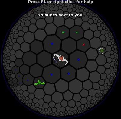 Minefield: Not all the areas you explore rely on special properties of hyperbolic planes. This entertaining zone is full of invisible mines you must avoid, natch, by playing minesweeper. The number of mines on adjacent spaces is clued by messages and colored dots: blue dots are adjacent to one mine, green dots to two, and red to three. Ground enemies lured in from other lands can set mines off too, but that can be a bad thing: exploded mines erupt in spaces of permanent fire, and if you get surrounded by impassible walls you immediately lose. Because the spaces you pass through are marked as you travel, it's easier to retrace your steps in this land than most others. The enemies here, "bombirds," are rare but create new mines when killed!